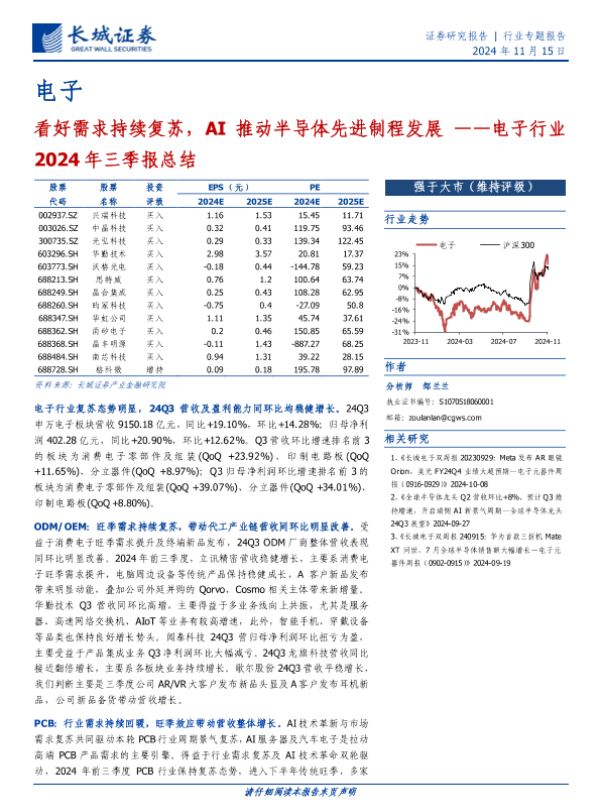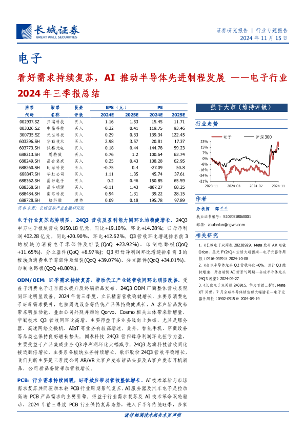 【长城证券】【20241128】电子行业2024年三季报总结:看好需求持续复苏,AI推动半导体先进制程发展-40页