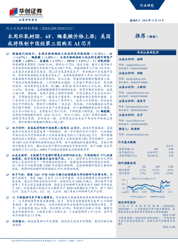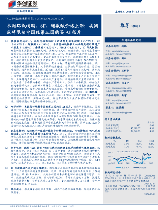 【华创证券】【20241218】化工行业新材料周报(-20241215):本周环氧树脂、6F、缬氨酸价格上涨,美国或将限制中国经第三国购买AI芯片-65页