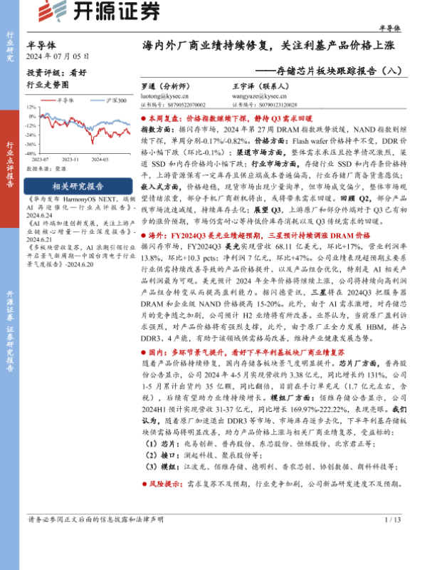 【开源证券】【20241212】存储芯片板块跟踪报告(八):海内外厂商业绩持续修复,关注利基产品价格上涨-13页