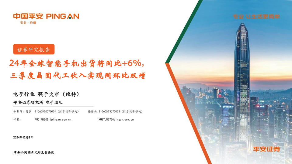 【平安证券】【20241218】24年全球智能手机出货将同比25,三季度晶圆代工收入实现同环比双增-12页