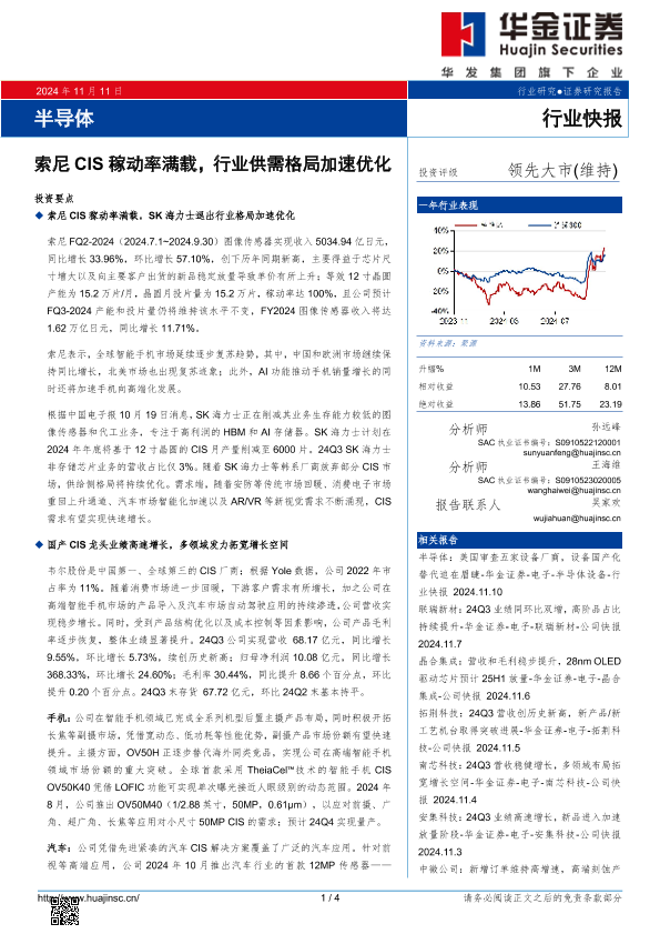 【华金证券】【20241220】半导体:索尼CIS稼动率满载,行业供需格局加速优化-4页