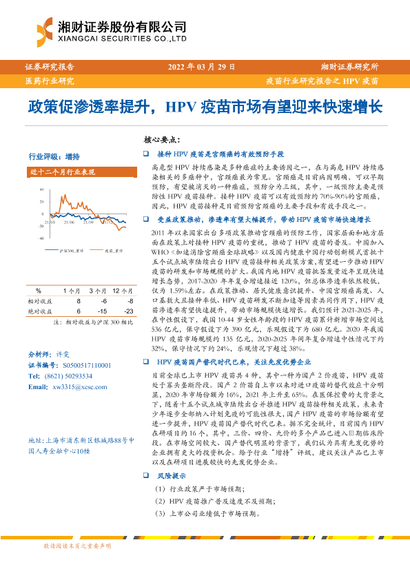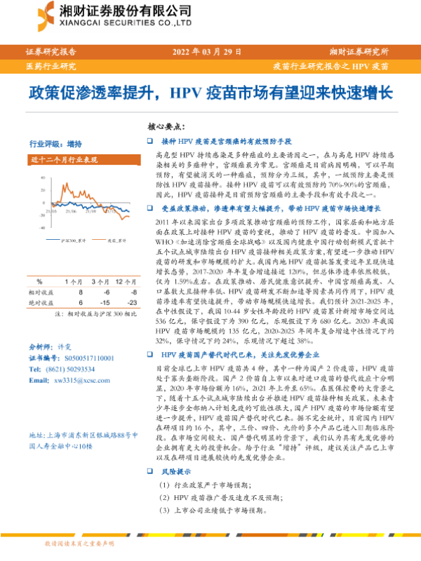 【湘财证券】【20220329】疫苗行业研究报告之HPV疫苗:政策促渗透率提升,HPV疫苗市场有望迎来快速增长-21页