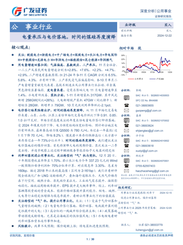 【广发证券】【20241222】2024年12月26日更新-公用事业行业深度分析:电量承压与电价落地时间的煤硅再度演绎-30页