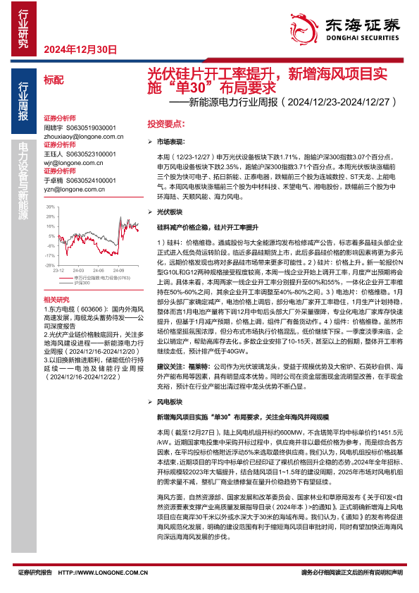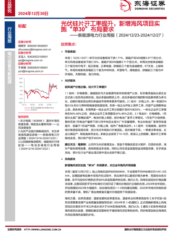 【东海证券】【20241230】2025年01月19日更新-【东海证券】新能源电力行业周报:光伏硅片开工率提升,新增海风项目实施“单30”布局要求-15页