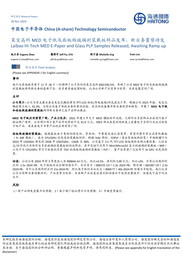 【海通国际】【20250204】中国电子半导体:莱宝高科MED电子纸及面板级玻璃封装载板样品发布,新业务蓄势待发-19页