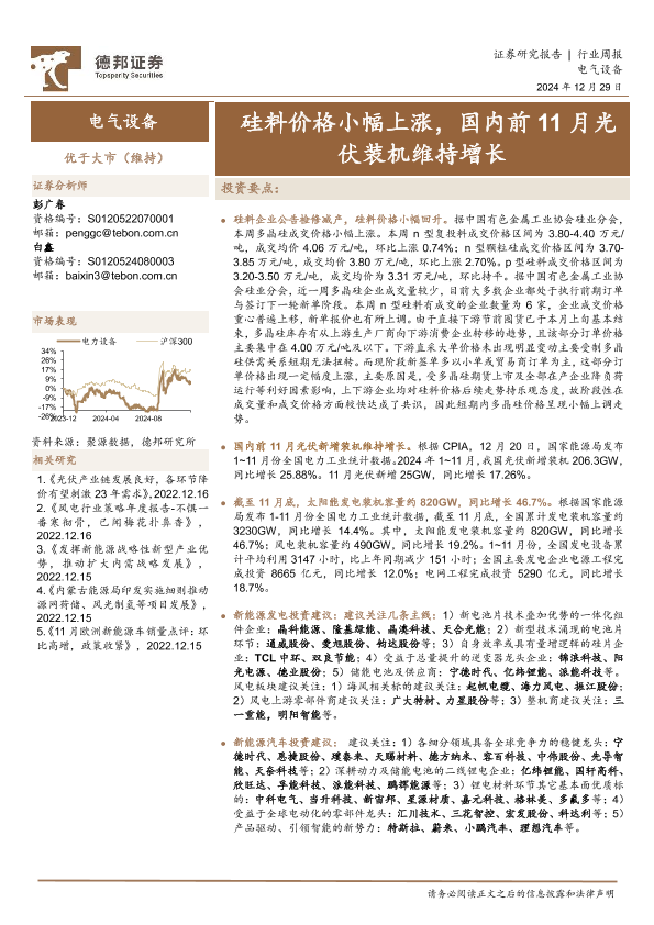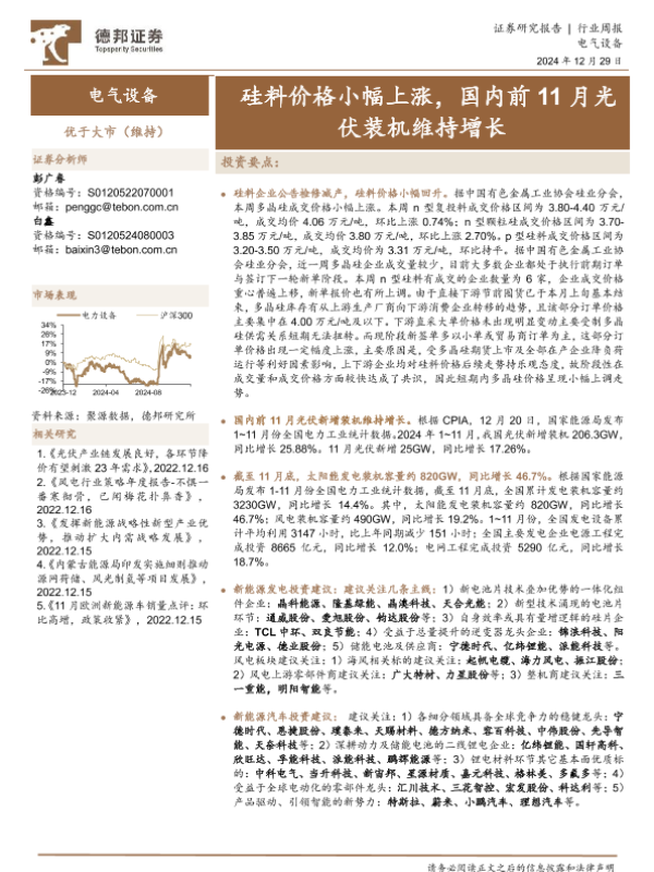 【德邦证券】【20241229】电气设备行业周报:硅料价格小幅上涨,国内前11月光伏装机维持增长-15页