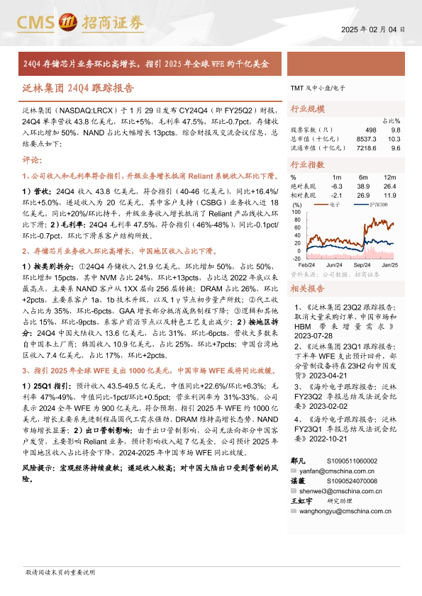【海通证券】【20250213】电子行业泛林集团24Q4跟踪报告:24Q4存储芯片业务环比高增长,指引2025年全球WFE约千亿美金-11页