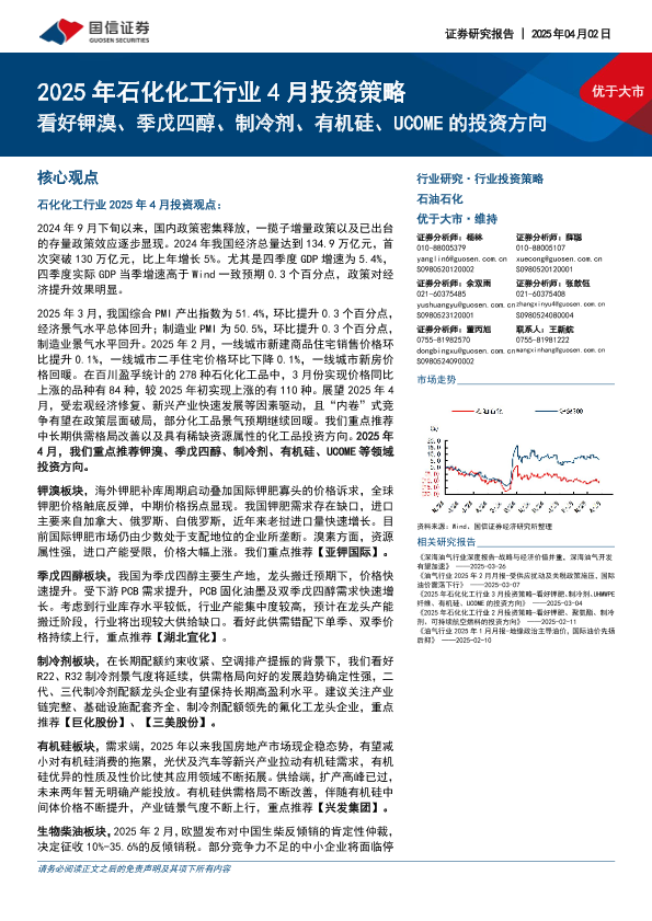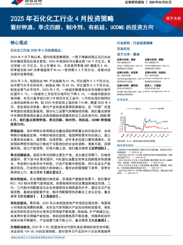 【国信证券】【20250405】2025年石化化工行业4月投资策略:看好钾溴、季戊四醇、制冷剂、有机硅、UCOME的投资方向-36页