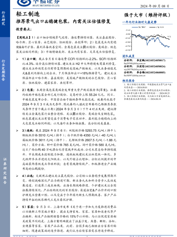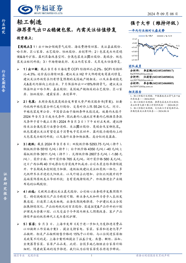 【华福证券】【20240908】2024年09月08日更新-【华福证券】轻工制造行业定期报告:推荐景气出口&稳健包装,内需关注估值修复-21页
