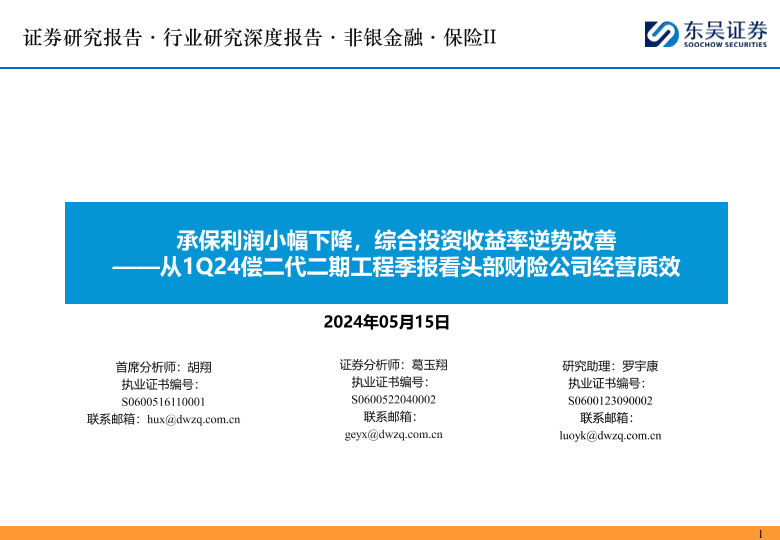 【东吴证券】【20240515】从1Q24偿二代二期工程季报看头部财险公司经营质效-承保利润小幅下降-综合投资收益率逆势改善-53页