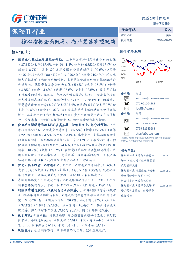 【广发证券】【20240903】2024年09月04日更新-保险Ⅱ行业:核心指标全面改善行业复苏有望延续-240903-24页
