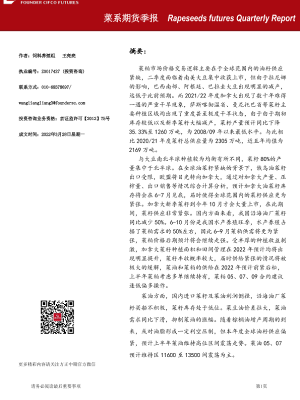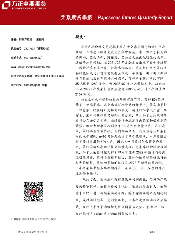 【方正中期期货】【20220328】菜系期货季报-20220328-30页