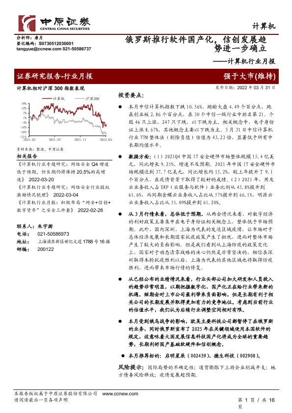【中原证券】【20220331】计算机行业月报:俄罗斯推行软件国产化,信创发展趋势进一步确立-16页