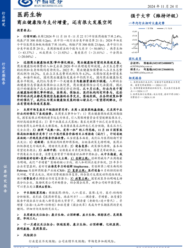 【华福证券】【20241124】2024年12月09日更新-【华福证券】医药生物行业定期报告:商业健康险为支付增量,还有很大发展空间-13页