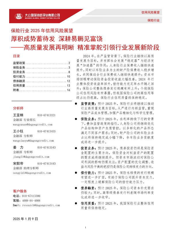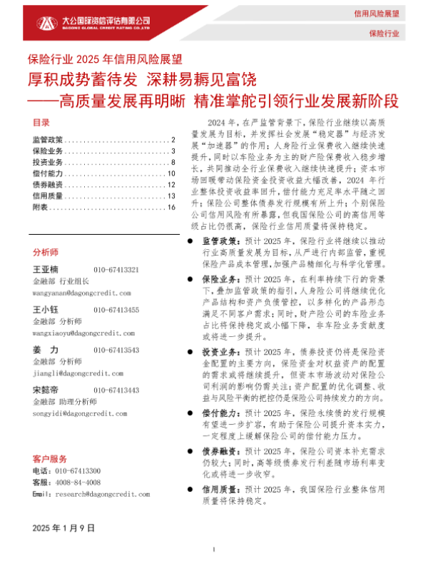 【大公国际】【20250117】保险行业2025年信用风险展望:高质量发展再明晰精准掌舵引领行业发展新阶段——厚积成势蓄待发深耕易耨见富饶-17页