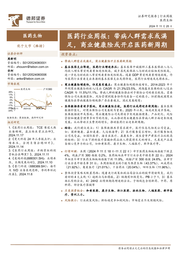 【德邦证券】【20241125】医药行业周报:带病人群需求或满足,商业健康险或开启医药新周期-15页