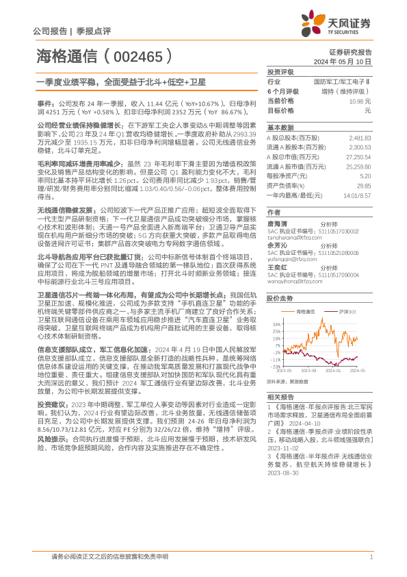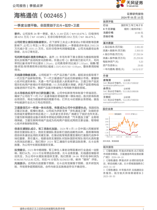 【天风证券】【20240510】2024年06月01日更新-一季度业绩平稳,全面受益于北斗+低空+卫星-4页
