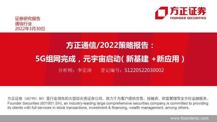 【方正证券】【20220330】通信行业2022策略报告:5G组网完成,元宇宙启动(新基建+新应用)-61页