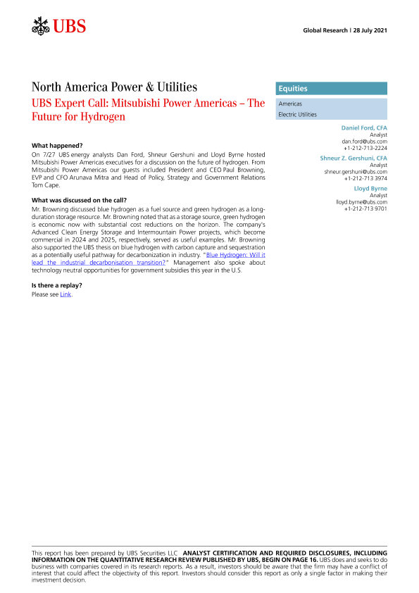 【瑞银 (UBS)】【20210728】瑞银-美股电力公用事业行业-三菱电力美国公司:氢的未来-23页