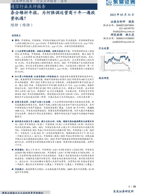 【东吴证券】【20220331】通信行业点评报告:条分缕析年报,为何强调运营商十年一遇投资机遇?-20页