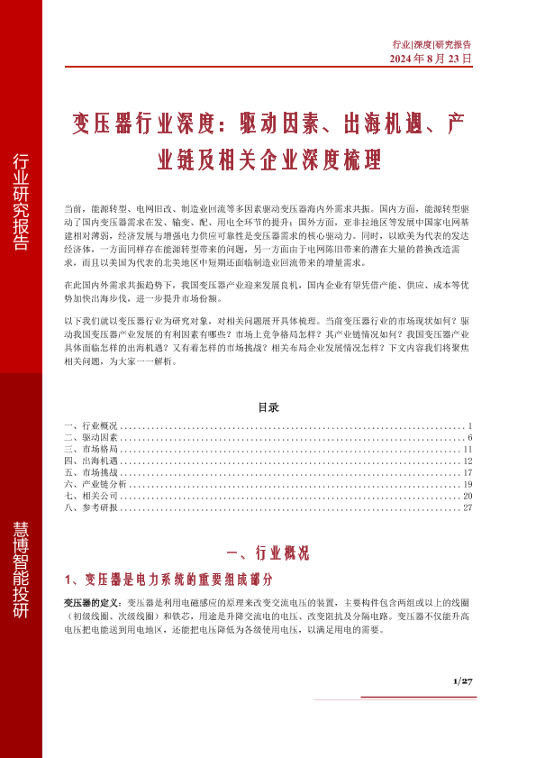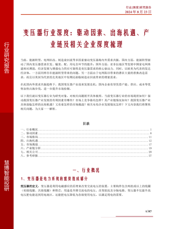 【慧博智能投研】【20240823】变压器行业深度:驱动因素、出海机遇、产业链及相关企业深度梳理-27页