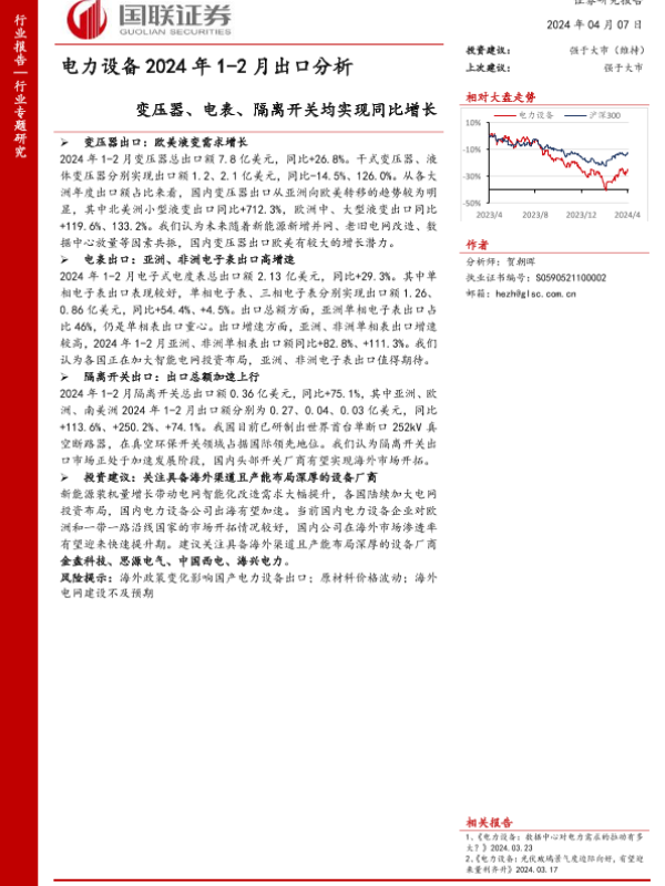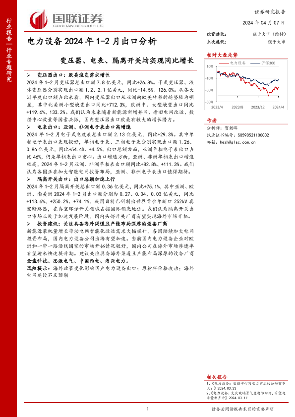 【国联证券】【20240407】电力设备2024年1-2月出口分析:变压器、电表、隔离开关均实现同比增长-25页