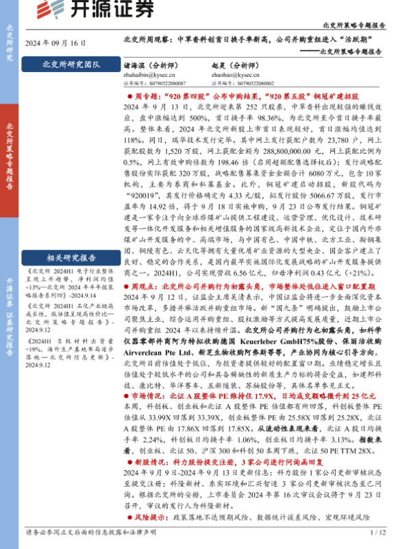【开源证券】【20240925】北交所周观察:中草香料创首日换手率新高,公司并购重组进入“活跃期”-12页