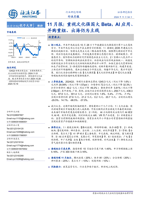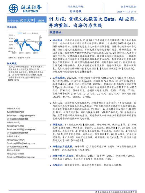 【海通证券】【20241104】2024年11月13日更新-【海通证券】传媒行业月报-11月报:重视文化强国大Beta,AI应用、并购重组、出海仍为主线-11页