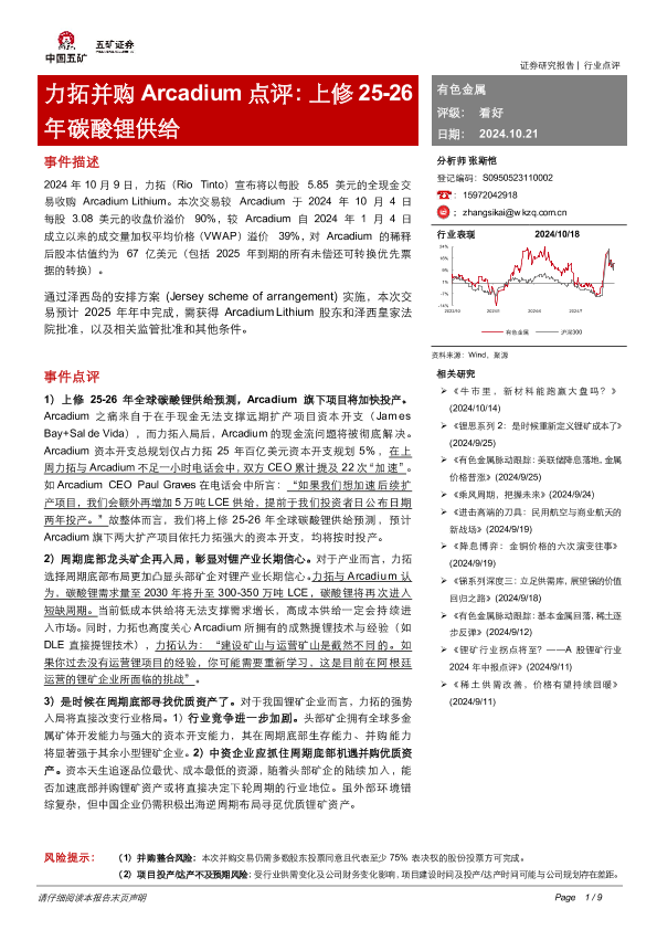 【五矿证券】【20241021】有色金属:力拓并购Arcadium点评:上修25-26年碳酸锂供给-9页