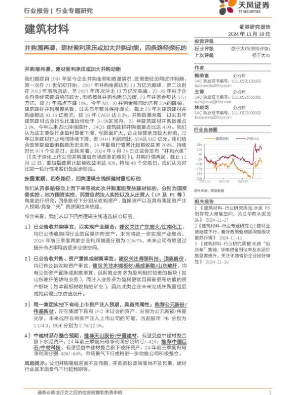 【天风证券】【20241118】2024年11月29日更新-【天风证券】建筑材料行业专题研究:并购潮再袭,建材盈利承压或加大并购动能,四条路径探标的-13页