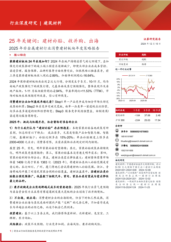 出海 建材补贴 收并购 消费建材 非金属建材