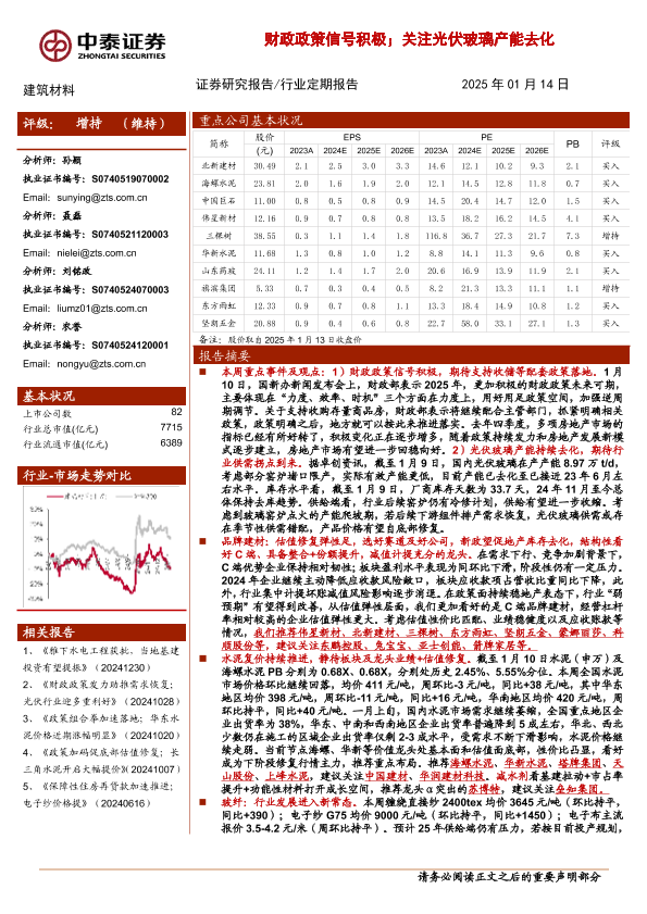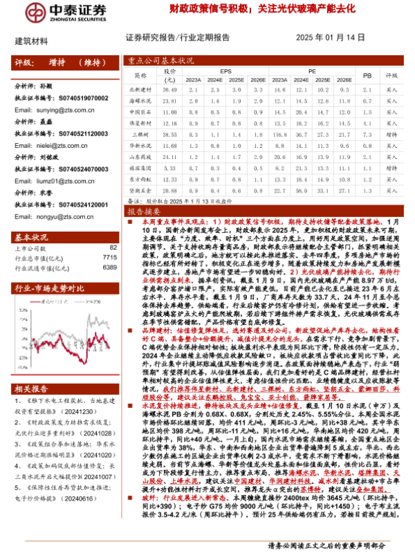【中泰证券】【20250114】2025年01月25日更新-【中泰证券】建筑材料行业:财政政策信号积极;关注光伏玻璃产能去化-20页