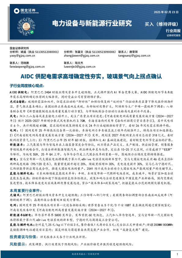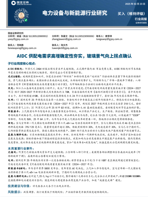 【国金证券】【20250304】2025年03月04日更新-【国金证券】AIDC供配电需求高增确定性夯实,玻璃景气向上拐点确认电力设备与新能源行业研究-18页