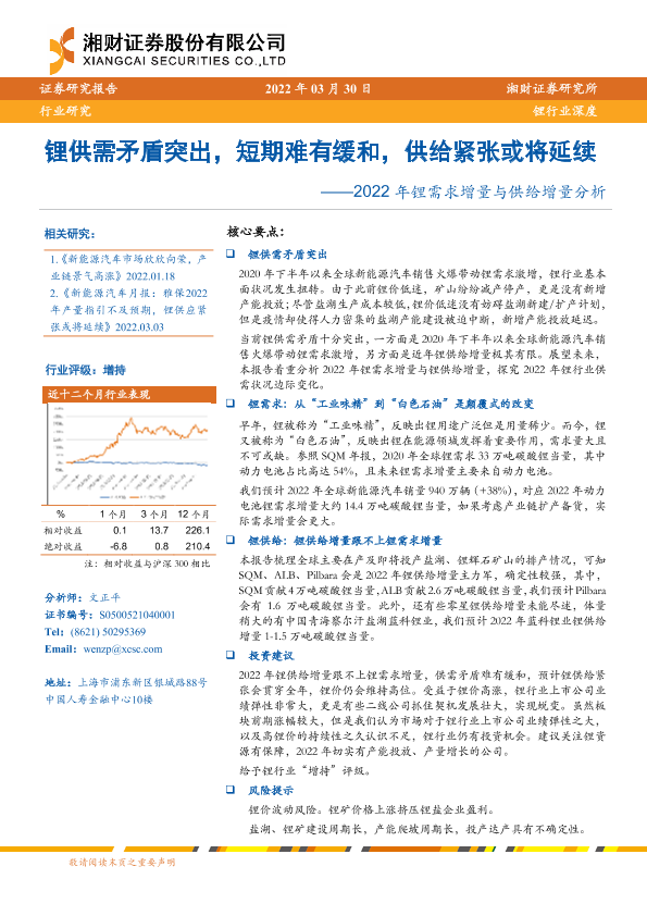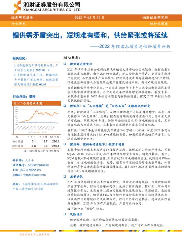 【湘财证券】【20220330】锂行业深度:2022年锂需求增量与供给增量分析,锂供需矛盾突出,短期难有缓和,供给紧张或将延续-25页