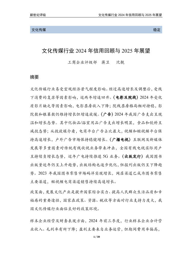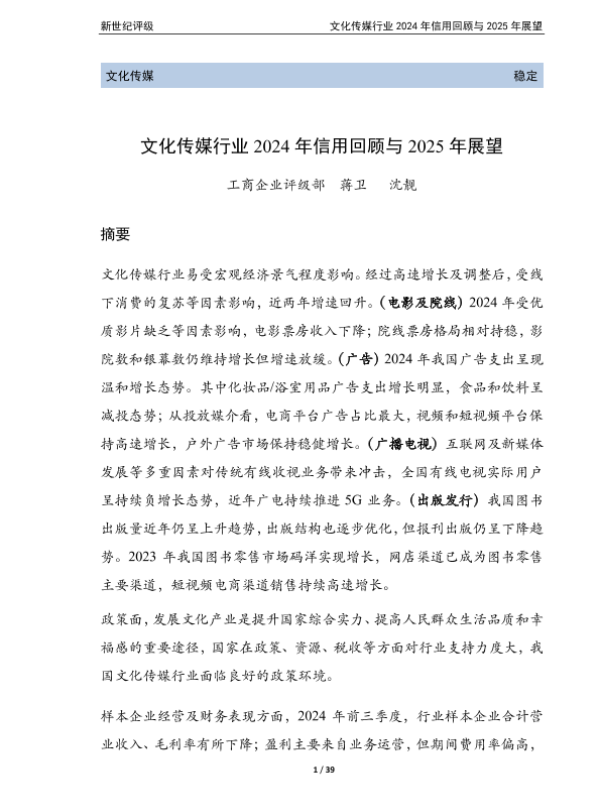 【新世纪评级】【20250208】文化传媒行业2024年信用回顾与2025年展望-39页