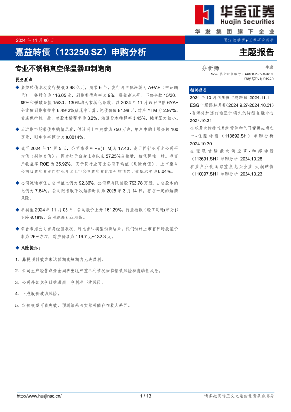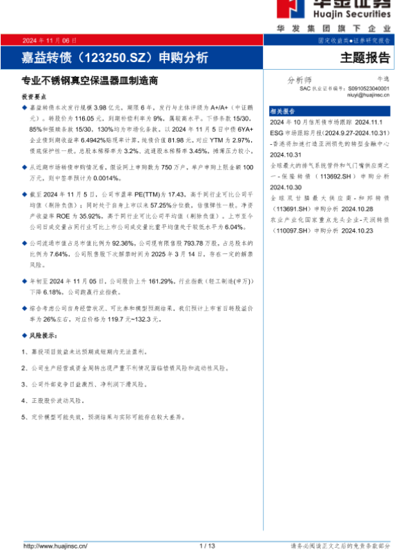 【华金证券】【20241106】嘉益转债(123250.SZ)申购分析:专业不锈钢真空保温器皿制造商-13页