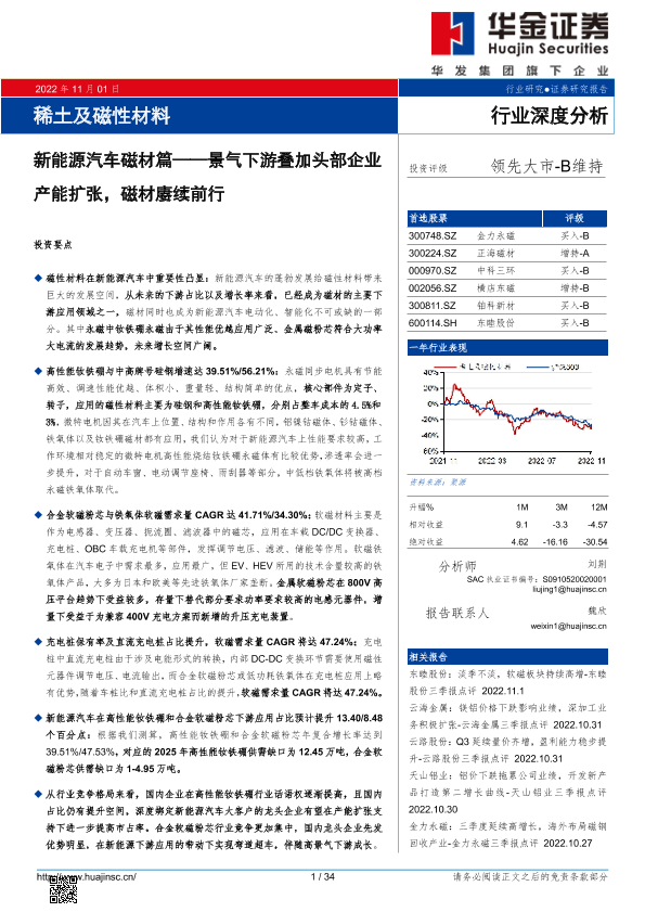 【华金证券】【20221101】稀土及磁性材料行业深度分析新能源汽车磁材篇-景气下游叠加头部企业产能扩张磁材赓续前行-34页