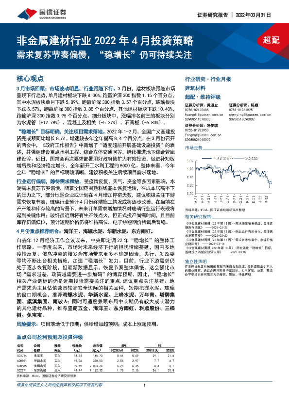 【国信证券】【20220331】非金属建材行业2022年4月投资策略:需求复苏节奏偏慢,“稳增长”仍可持续关注-25页