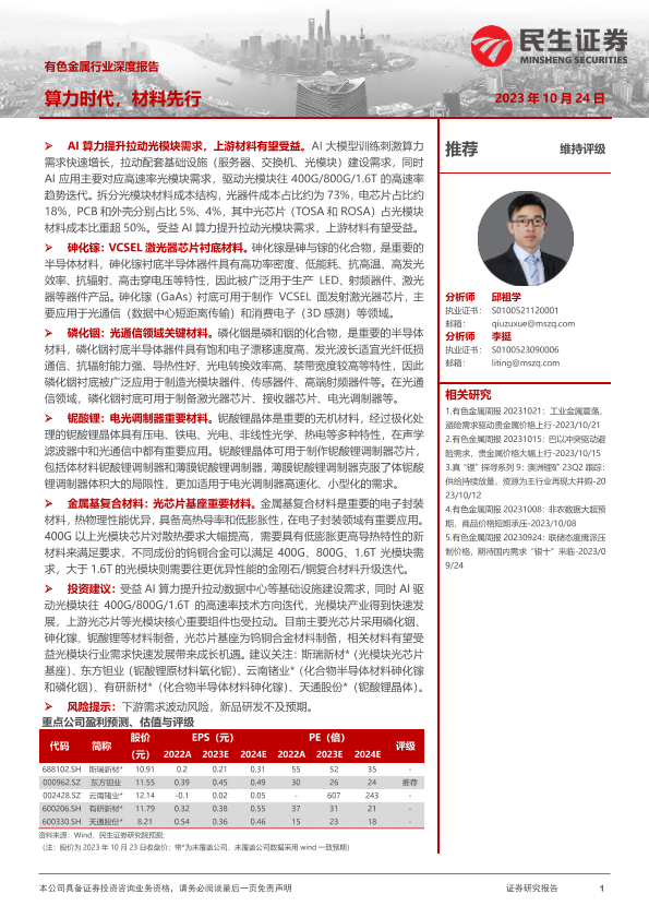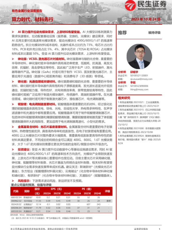 【民生证券】【20231024】2023年10月10日更新-有色金属-算力时代,材料先行-41页