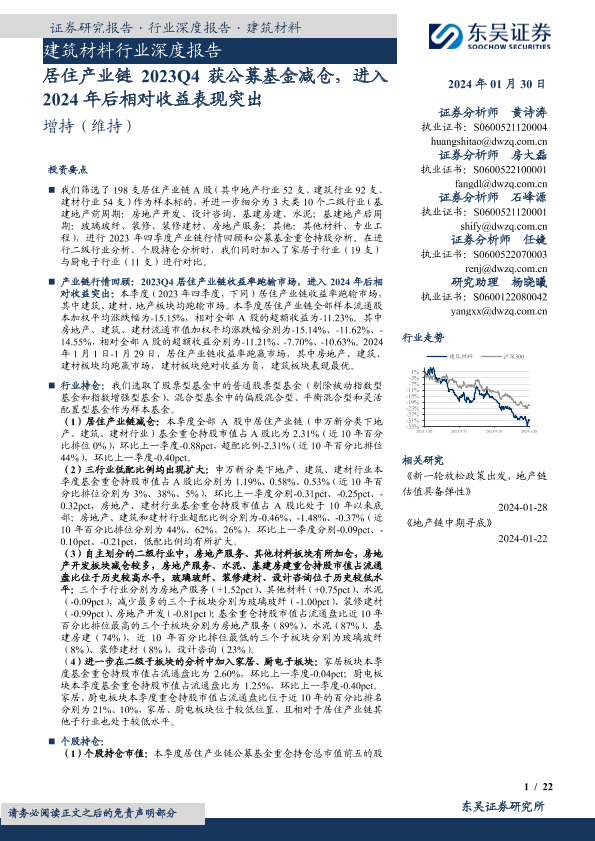 【东吴证券】【20240130】建筑材料行业深度报告-居住产业链2023Q4获公募基金减仓-进入2024年后相对收益表现突出-22页