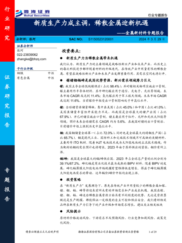 【渤海证券】【20240802】2024年08月02日更新-金属新材料行业专题报告新质生产力成主调稀散金属迎新机遇-29页