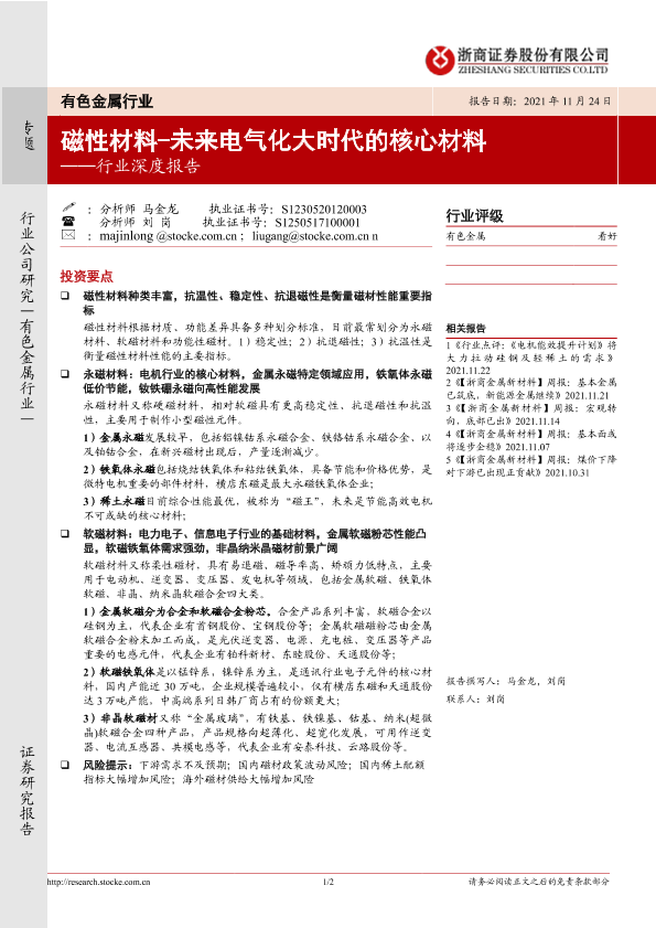 有色金属 永磁材料 电气化 磁性材料 软磁材料