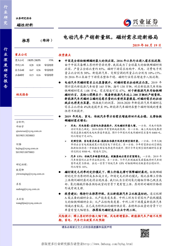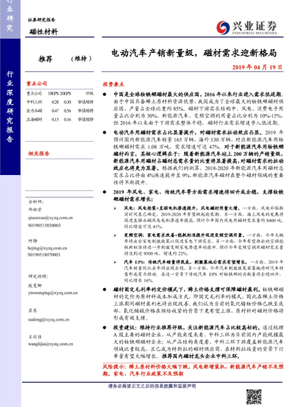 【兴业证券】【20190419】电动汽车产销新量级,磁材需求迎新格局-24页
