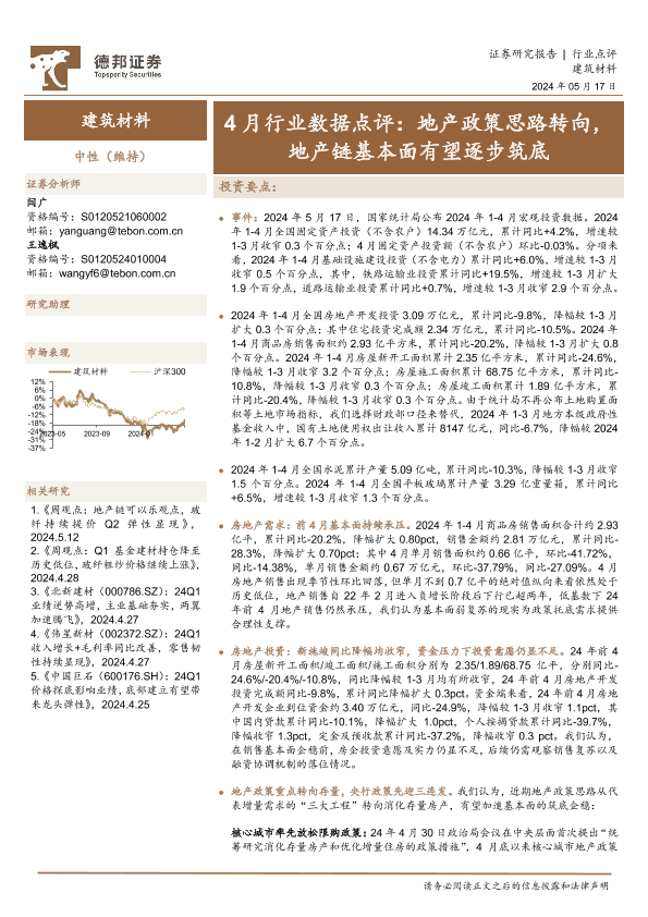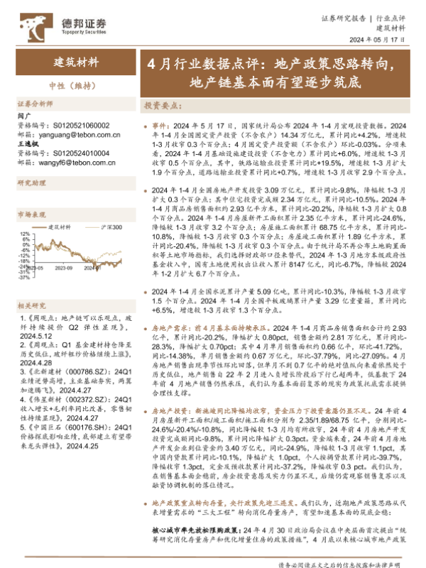 【德邦证券】【20240517】建筑材料4月行业数据点评:地产政策思路转向,地产链基本面有望逐步筑底-11页