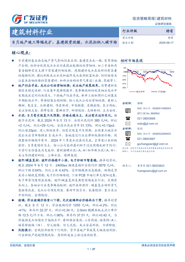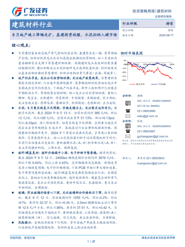 【广发证券】【20240917】2024年09月27日更新-【广发证券】建筑材料行业:8月地产竣工降幅走扩,基建投资放缓,水泥拟纳入碳市场-27页