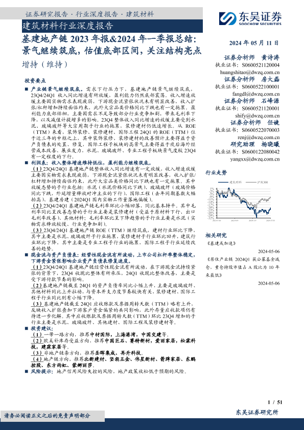【东吴证券】【20240511】基建地产链2023年报&2024年一季报总结:景气继续筑底,估值底部区间,关注结构亮点-51页