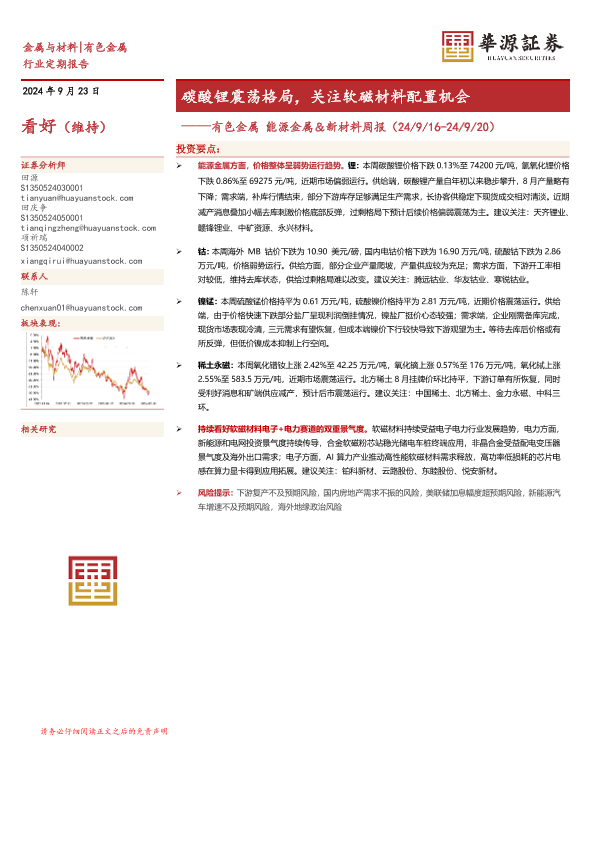 【华源证券】【20241013】2024年10月13日更新-【华源证券】有色金属行业能源金属&新材料周报:碳酸锂震荡格局,关注软磁材料配置机会-16页