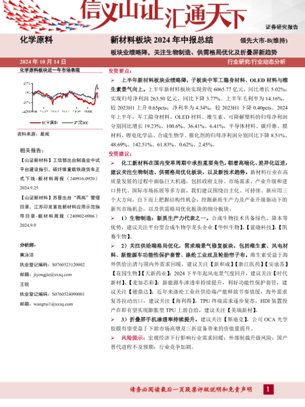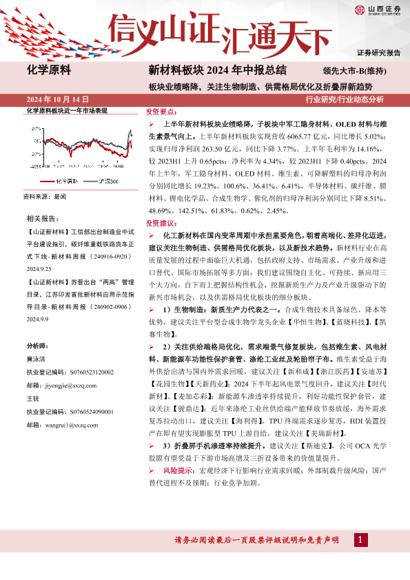 【山西证券】【20241014】2024年10月17日更新-新材料板块2024年中报总结:板块业绩略降关注生物制造、供需格局优化及折叠屏新趋势-16页