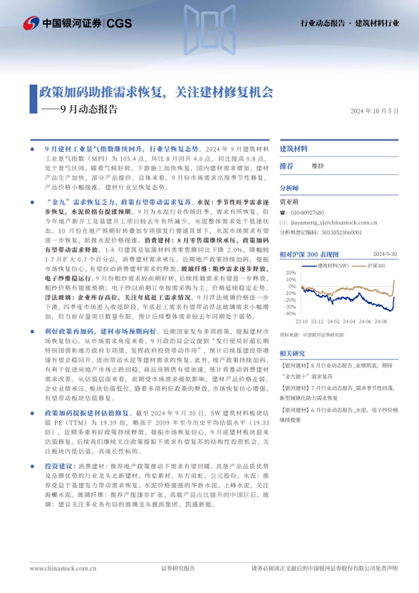 【银河证券】【20241005】2024年10月18日更新-【银河证券】建筑材料行业9月动态报告:政策加码助推需求恢复,关注建材修复机会-23页