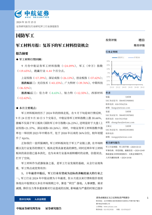 【中航证券】【20241024】国防军工行业军工材料月报:复苏下的军工材料投资机会-16页